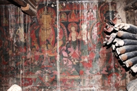 Constructed about 100 years ago, the tulku’s residence (gungbar labrang) is positioned across from the main Scripture Hall of Badha Monastery. The residence complex is composed of three floors—the ground floor is for raising cattle and for storing firewood and other items. The second floor comprises the living quarters for the tulku and his attendants as well as a scripture hall. The second floor also connects with what the monks currently living in the monastery refer to as the “Dharmapala Hall,” where the wall paintings and sculptures were discovered. The third floor of the residence serves as a terrace.