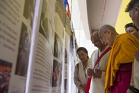His Holiness the Dalai Lama looking at an exhibit during his visit to the Festival of Tibetan Culture being held at Somaiya Vidyavihar campus in Mumbai, India on May 30, 2014. Photo/Tenzin Choejor/OHHDL