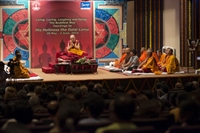 He said that because he was going to explain the Buddha’s teachings he would like to begin with a recitation in Pali of the ‘Mangalam Sutta’, followed by ‘An Invocation of the Seventeen Great Sagacious Adepts of Glorious Nalanda,’ recited simultaneously in Tibetan, Hindi and English. He quoted from the colophon that prayer to explain why he had composed it: ‘At the present time, when in the ordinary world there is great advancement in the fields of science and technology, but we are also distracted by the hustle and bustle of our busy lives, it is extremely important that those of us who follow the Buddha should have faith based on knowledge of his teaching. Therefore, we should examine the reasons for it with an unbiased and inquisitive mind, analyzing them closely.’