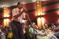 An member of the audience asking His Holiness the Dalai Lama a question during the first day of his four day teaching at Somaiya Vidyavihar campus in Mumbai, India on May 30, 2014. Photo/Tenzin Choejor/OHHDL