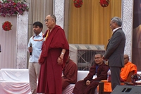There was some turbulence on the flight from Surat and on arrival at Nashik the weather was unexpectedly misty and overcast. Having been received at the airport by representatives of the Indo-Tibetan Mangal Maitri Sangh, His Holiness drove into the city where a gathering, estimated to number more than 4500, Tibetans and Indians, waited patiently to hear him. He joined Burmese, Indian and Sri Lankan Buddhist monks and Christian priests on the stage and began by asking for a show of hands to see how many listeners needed a Hindi translation, which was about half the audience. Dispensing with further formality he began: