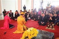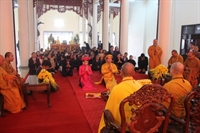 Mở đầu buổi lễ, chư tôn đức cùng họ hàng hai bên đã làm lễ niêm hương bạch Phật, cầu nguyện cho hai bạn được hạnh phúc, yêu thương nhau trọn đời. HT.Thích Bảo Nghiêm, thay mặt chư Tăng tác pháp quy y Tam Bảo và trao truyền Ngũ Giới để làm kim chỉ nam cho cuộc sống hiện tại.