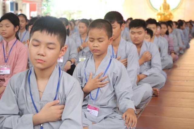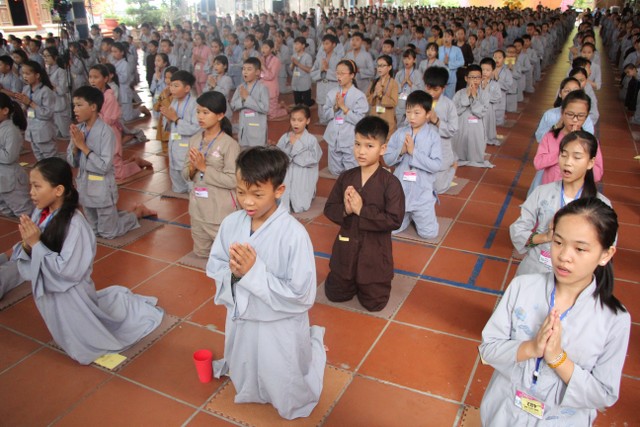Buổi chiều cùng ngày, Thượng tọa trụ trì cùng chư tôn đức Tăng Ni đã tác pháp quy y Tam Bảo, truyền trao năm giới quý báu để mỗi bạn trẻ làm điểm tựa tâm linh, hoàn thiện nhân cách, tránh xa các điều ác. Bên cạnh đó, các bạn còn được Sư cô Diệu Tấn hướng dẫn lạy Phật theo nhạc và tập khí công Phật gia để tu tập hạnh lành, rèn luyện sức khỏe.