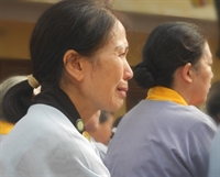 Còn với bà Thân, 70 tuổi, dù cho trên ngực đeo một bông hoa đỏ nhưng bà vẫn khóc nức nở suốt buổi lễ Vu Lan.