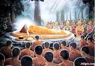佛陀八十歲那年,抱病來到末羅國的拘尸那城。佛陀知道自己即將入滅,所以到了城中的沙羅林,就不再前進了,選擇了林中的雙樹間為入滅處。佛陀要求尊者阿難在雙樹間為他鋪床,然後頭朝北,面向西,雙足交疊側臥,仍然保持了正知正念。這時,沙羅樹雖然不是在開花的季節,竟然開滿了花,花朵從樹上掉落下來,紛紛落在佛陀身上。除了沙羅樹的花以外,還有更多的曼陀羅花與栴檀香末,從空中飄下,落在佛陀身上,也飄滿了附近的地面,空中還響起了音樂與歌聲。