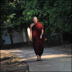 After their heads are shaved at an ordination ceremony, new monks - foreign or Burmese - retreat to the quiet but challenging routine of monastic life. Rising at 3.30am, they practice sitting and walking meditation for the majority of the day, spending long periods cross- legged in the complex, which is largely silent apart from the sound of birdsong.