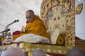 |  His Holiness the Dalai Lama acknowledging the audience at the start of his teaching in Likir, Ladakh, J&K, India on July 1, 2014. Photo/Tenzin Choejor/OHHDL