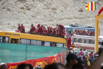 |  Some of the many monks that attended His Holiness the Dalai Lama's teaching leaving for their monasteries after the teaching in Likir, Ladakh, J&K, India on July 1, 2014. Photo/Tenzin Choejor/OHHDL