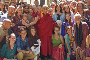 His Holiness the Dalai Lama posing for a photo with some of the 1500 people attending his public audience in Dharamsala, HP, India on May 28, 2014. Photo/Jeremy Russell/OHHDL