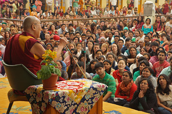 His Holiness the Dalai Lama speaking to over 1500 foreigners and Indians attending his public audience in Dharamsala, HP, India on May 28, 2014. Photo/Jeremy Russell/OHHDL
