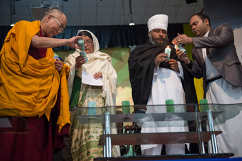 | His Holiness the Dalai Lama and other representatives of spiritual traditions lighting candles at the start of an interfaith event in Shillong, Meghalaya, India on February 5, 2014. Photo/Tenzin Choejor/OHHDL