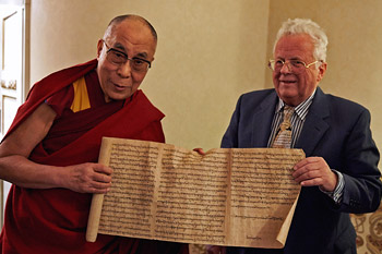 | Norwegian book collector Martin Schøyen presenting to His Holiness the Dalai Lama examples of ancient Buddhist texts in Tibet in Oslo, Norway on May 8, 2014. Photo/Oliver Adam