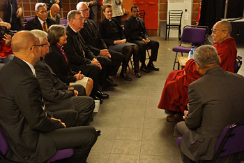 As His Holiness started out for the day, Norwegian private book collector Martin Schøyen presented him examples of ancient Buddhist texts in Tibetan, including a page from the ‘Amitayus Sutra’ that he said was the oldest Tibetan text in existence. Arriving at Oslo University, Tibetans and Norwegian friends had gathered to welcome him. Once inside he had a brief meeting with a group of several Christian bishops and priests. He said: