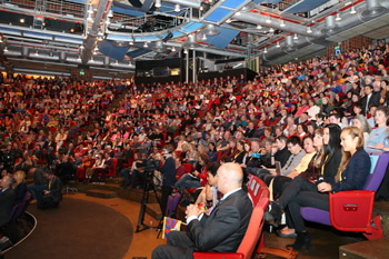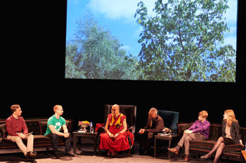 | | Students listening to His Holiness the Dalai Lama speaking at Auditorium Oslo University in Oslo, Norway on May 8, 2014. Photo/Oliver Adam | Four students spoke articulately about their views of the future: one asked shouldn’t we recycle more, use public transport and reduce our energy consumption. Another appreciated the need to work with each other and to teach more in schools about what needs to be done for the future. Another questioned whether the problem isn’t that human beings are prone to taking short-sighted decisions. The young woman among them said her generation would be bringing children into a world in distress. She wanted young people to have a veto on policies being implemented now that will have negative consequence she and her peers will have to clear up. She said, for example, that there is no clean way of polluting, so the focus on petroleum has to change.