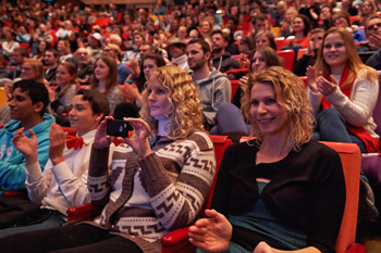 His Holiness attended a discussion with students in the afternoon focussed on the theme ‘Taking Responsibility for Tomorrow’s World’. The occasion opened with a startling flute recital by Tale Coleman and continued with an introduction by Oslo University Rector Ole Petter Ottersen. He remarked that for decades His Holiness has been the face of Tibet and speculated that the world would be a better place if its battles were fought through dialogue and argument as His Holiness commends.