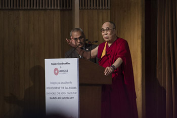 His Holiness the Dalai Lama speaking at the Indian Habitat Centre in New Delhi, India on September 22, 2014. Photo/Tenzin Choejor/OHHDL