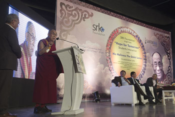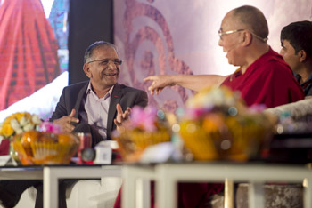 His Holiness the Dalai Lama gestures at Shree Ramkrishna Exports chairman Govind Dholakia during his talk at Veer Narmad South Gujarat University in Surat, Gujarat, India on January 1, 2015. Photo/Tenzin Choejor/OHHDL