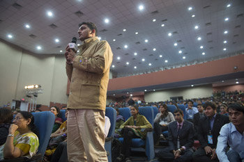 A member of the audience asking His Holiness the Dalai Lama a question during his talk at Veer Narmad South Gujarat University in Surat, Gujarat, India on January 1, 2015. Photo/Tenzin Choejor/OHHDL