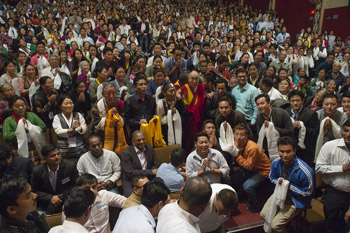 His Holiness the Dalai Lama with over 750 Tibetans who do business in Gujarat during their meeting in Surat, Gujarat, India on January 1, 2015. Photo/Tenzin Choejor/OHHDL