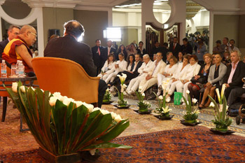 His Holiness the Dalai Lama speaking to members of the press in Mexico City on October 11, 2013. Photo/Jeremy Russell/OHHDL