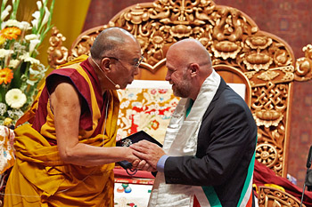 His Holiness the Dalai Lama thanking Livorno Mayor Filippo Nogarin after being presented with the Key to the City in Livorno, Tuscany, Italy on June 14, 2014. Photo/Olivier Adam
