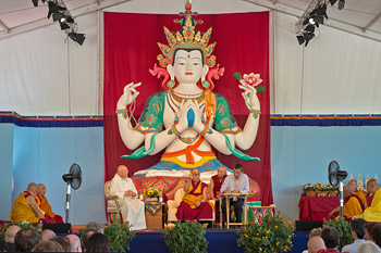 Pomaia, Tuscany, Italy, 13 June 2014 - This morning His Holiness the Dalai Lama blessed the five meter tall four-arm Chenrezig statue at Lama Tsong Khapa Institute. He praised the craftsmen who built the statue offering scarves in appreciation. Speaking to a gathering of around 1000 people, he said that it was more important to study the actual teachings rather than to just worship statues. Buddhists, he said, should take actual refuge in Buddha's teachings rather than statues.