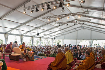 When it was his turn to speak His Holiness thanked the previous speakers and expressed his appreciation to the people of Italy for their warm welcome. He praised the efforts of Zopa Rinpoche, for his foresightedness in keeping the Nalanda tradition alive in his institutes.