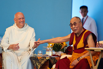 His Holiness the Dalai Lama with his old Fr. Laurence Freeman, Director of The World Community for Christian Meditation, during the program at Istituto Lama Tzong Khapa (ILTK) in Pomaia, Tuscany, Italy on June 13, 2014. Photo/Olivier Adam