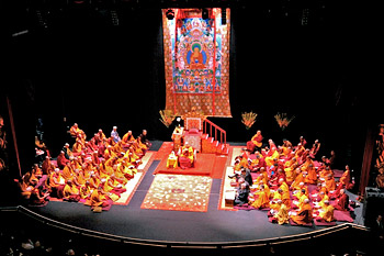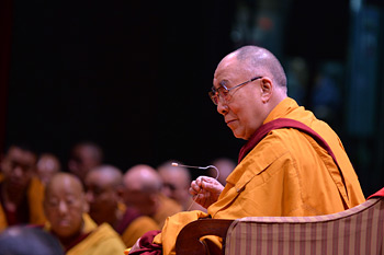 New York, NY, USA, 4 November 2014 - His Holiness the Dalai Lama lost no time after arriving in the historic Beacon Theater this morning. He saluted the Buddha, took his seat in a comfortable chair and recited the Heart Sutra at a crisp pace before resuming his reading of extracts from Tsongkhapa’s ‘Essence of True Eloquence’.