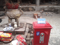 đám đông là chiếc két sắt sơn màu đỏ đặt cạnh đỉnh hương to lớn. Trên