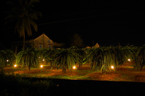 Mỗi tối, để thúc cho cây Thanh Long ra hóa và kết quả kịp cho mùa Tết người dân đã thắp những bóng đèn điện chạy dọc mỗi hàng cây. Những bông hoa Thanh Long vốn giống như hoa Quỳnh, như rực rỡ dưới hơn dưới ánh sáng.