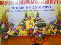 Sau phần nghi lễ Đại hội, ĐĐ.Thích Nguyên Sắc đọc diễn văn khai mạc; ĐĐ.Thích Nguyên Tấn, Chánh Thư ký thay mặt BTS PG TP.Phan Thiết đọc báo cáo tổng kết Phật sự trong nhiệm kỳ VII (2012-2016).