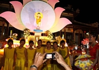 | Đông đảo du khách nước ngoài chiêm ngưỡng đoàn xe hoa rước Phật. | |