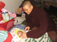 Sư thầy Đàm Lan chuẩn bị cho em bé bị bỏ rơi lần đầu đón Tết tại chùa. Ảnh: T.G |
