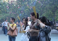 Vừa hết giờ làm việc, nhiều người đổ về các ngôi chùa thắp nhang cầu nguyện... - Ảnh V.An
