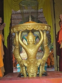 cầm trên tay mình chiếc lộng che, lá cờ ngũ sắc hoặc một nhành hoa đứng