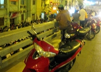 đường dừng xe ở lòng đường, rồi lên ngồi cầu khấn ngay ở vạt cỏ dải phân