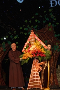 TT.Thích Thiện Bảo, Trưởng Ban Văn hóa THPG TP.HCM tặng hoa cảm ơn đơn vị tài trợ - Công ty Truyền thông Mani
