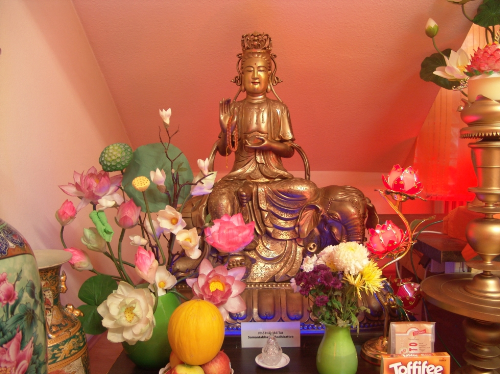 bên trái của Đức Phật . Bồ tát Phổ Hiền biểu thị Đại hạnh, Bồ tát Văn