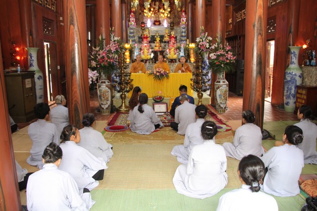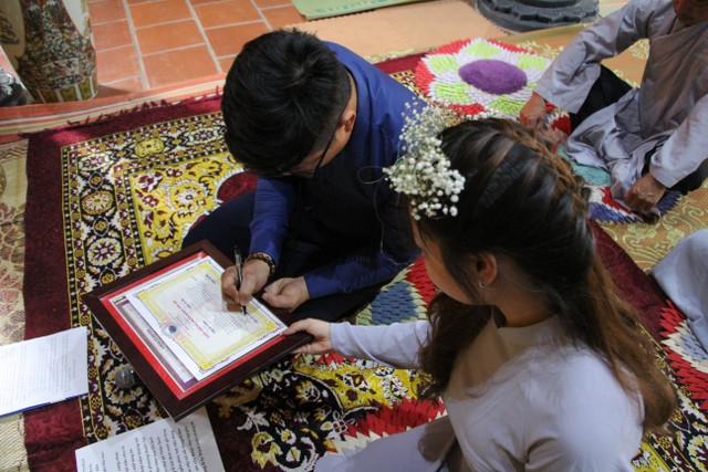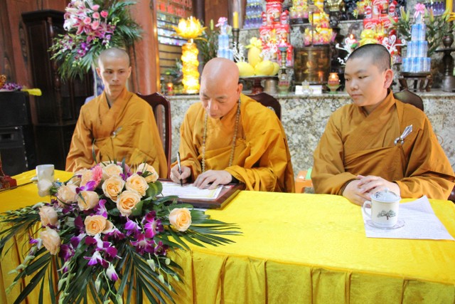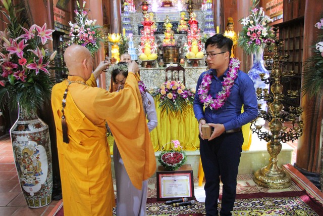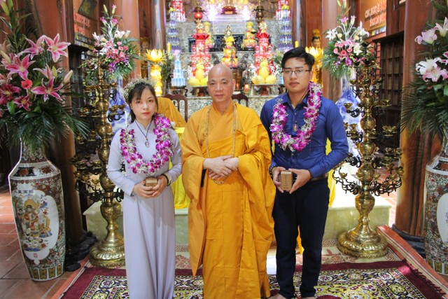 Mở đầu buổi lễ, chư Tăng đã tác pháp quy y Tam Bảo để hai bạn nương tựa tu học Phật pháp, xây dựng hạnh phúc gia đình. Tiếp đó, đôi bạn đã đối trước Tam Bảo đọc lời thệ nguyện yêu thương nhau trọn đời và hộ trì chính pháp; đỉnh lễ công ơn sinh thành, dưỡng dục của song thân; đỉnh lễ tôn trọng sự bình đẳng của nhau. Sau đó, đích thân Thượng tọa trao quà cưới cho hai bạn. Trong niềm hoan hỷ của buổi lễ, quý Thầy đã khuyến tấn tân lang, tân nương phải sống trọn vẹn bổn phận làm vợ và làm chồng, làm dâu hiền, rể thảo cùng xây dựng hạnh phúc gia đình theo tinh thần hiểu biết và thương yêu của nhà Phật.
