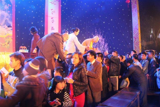 Tiếp đó là những tràng pháo tay dòn dã, những màn pháo sáng rực đón chào một mùa xuân mới đã về. Một phần không thể thiếu trong đem giao thừa đó chính là nhận phần quà pháp bảo từ thượng tọa trụ trì, dòng người cất cao tiếng niệm phật và lần lượt đến nhận lộc đầu xuân trong niềm hoan hỉ và an lạc.