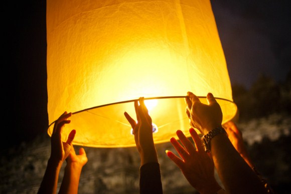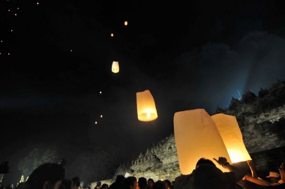 Phật đang thả một chiếc đèn trời ở chùa Borobudur trong dịp Lễ Phật