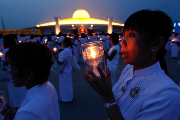 Phật tử cầm nến trên tay và đi vòng quanh Phật Đài Wat Phra