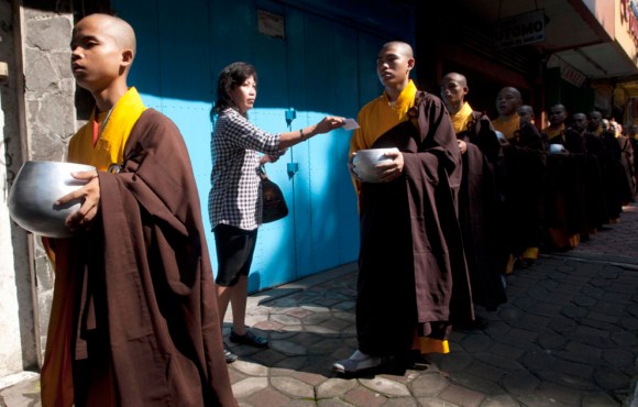 Một người dân đang bố thí cho các nhà sư đi khất thực trước ngày Lễ Phật Đản ở tỉnh Magelang, Indonesia, 16/05/2011.