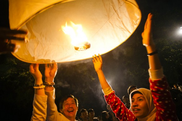 Các tín đồ Phật Giáo cùng nhau thả đèn trời ở chùa Borobudur trong dịp Lễ Phật Đản.