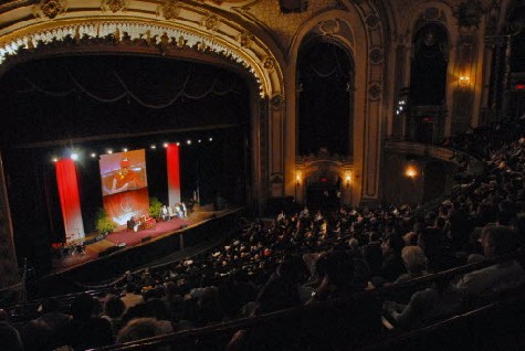 Đức Dalai Lama nói chuyện tại Hí Viện Palace ở  Albany May 6. (Ảnh: Philip Kamrass)